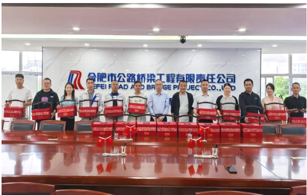 又是一年考学季,为助力莘莘学子金榜题名,2025年5月23日,合肥路桥开展了暖心的职工子女中高考关怀活动。公司党委书记、董事长杨枫,党委副书记、工会主席程勇带着公司满满的祝福,为19名子女参加中高考的职工送去“金榜题名”祝福礼。