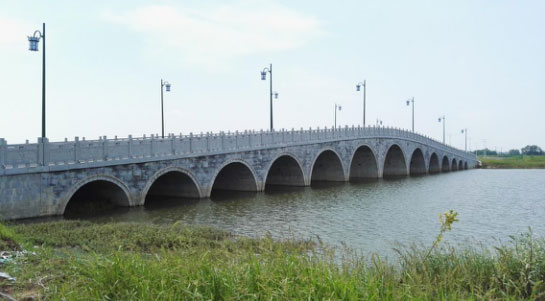 奎潭湖位于安徽省芜湖市南陵县许镇,处于 205 国道西南侧;环湖路绕奎潭湖一圈,全长约 12km,分为 A、B、C、D、E 线; A线道路全长6KM,含有AK3+965圆弧拱桥(13孔)、AK0+721圆弧拱桥(29孔);B线道路全长3.6KM、含有BKO+078圆弧拱桥(13孔)、BKO+634.5圆弧拱桥(33孔)、BK1+846.5圆弧拱桥(27孔)、BK3+149圆弧拱桥(9孔);C线道路全长690M;D线主要为593M栈桥;E线主要为750.5M栈桥。